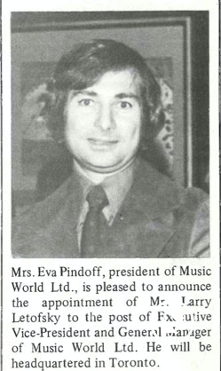 I then worked for Larry Letofsky at Yorkdale Shopping Centre. I became the warehouse Manager/Buyer for the chain of Music world Stores, and John Carnegie worked with me in the warehouse. These were all good years.